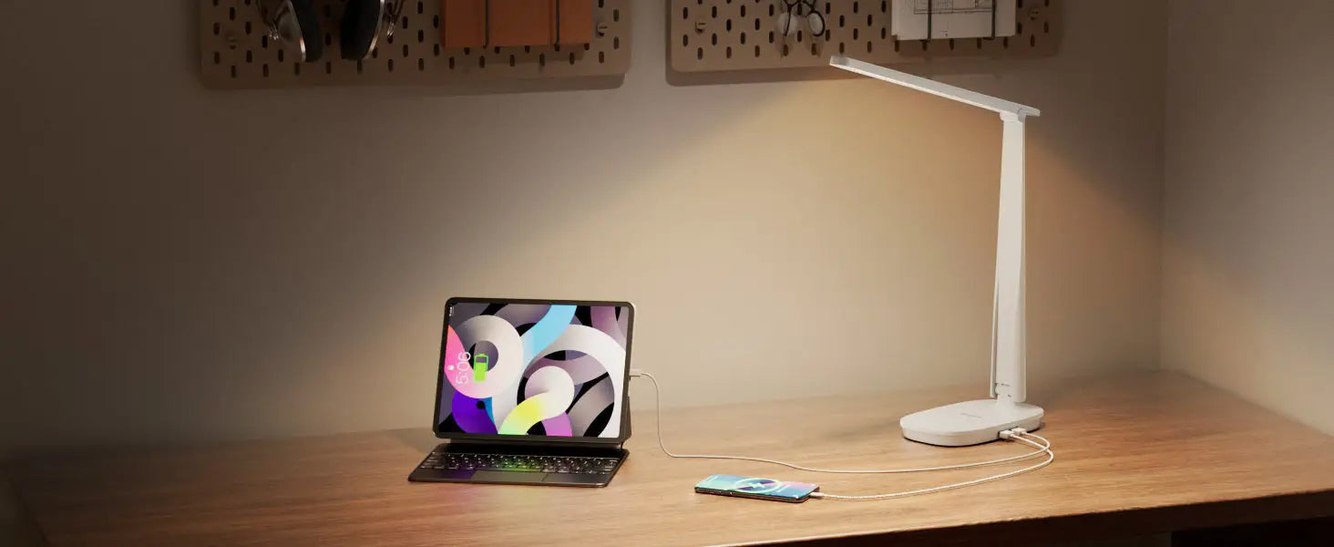 Dies macht sie zu einer idealen Schreibtischlampe mit Ladeanschluss für Nutzer, die häufig Telefone, Tablets, Bluetooth-Lautsprecher oder kabellose Ohrhörer tagsüber aufladen müssen. Durch die Kombination von Beleuchtung und Ladefunktion wird Ihr Arbeitsplatz aufgeräumter und die Abhängigkeit von Mehrfachsteckdosen reduziert.