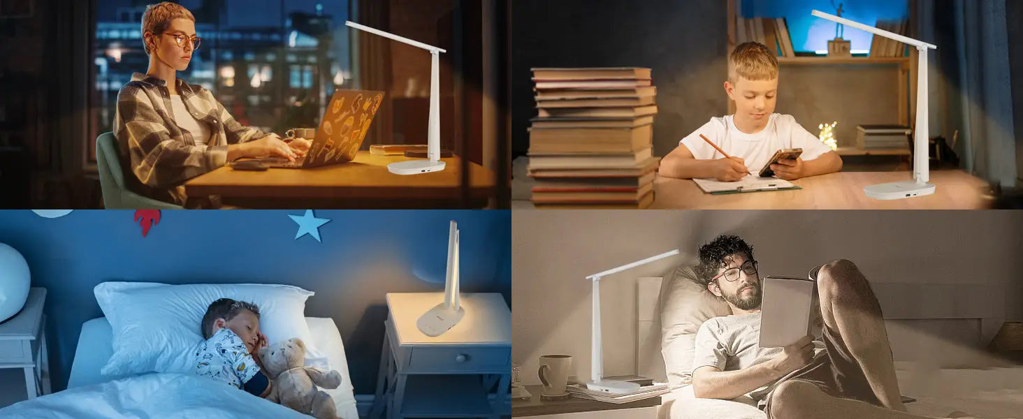 Das klappbare Design und die Ladeanschlüsse machen sie zur idealen Studenten-Schreibtischlampe für nächtliche Aufgaben und die Nutzung mobiler Geräte.