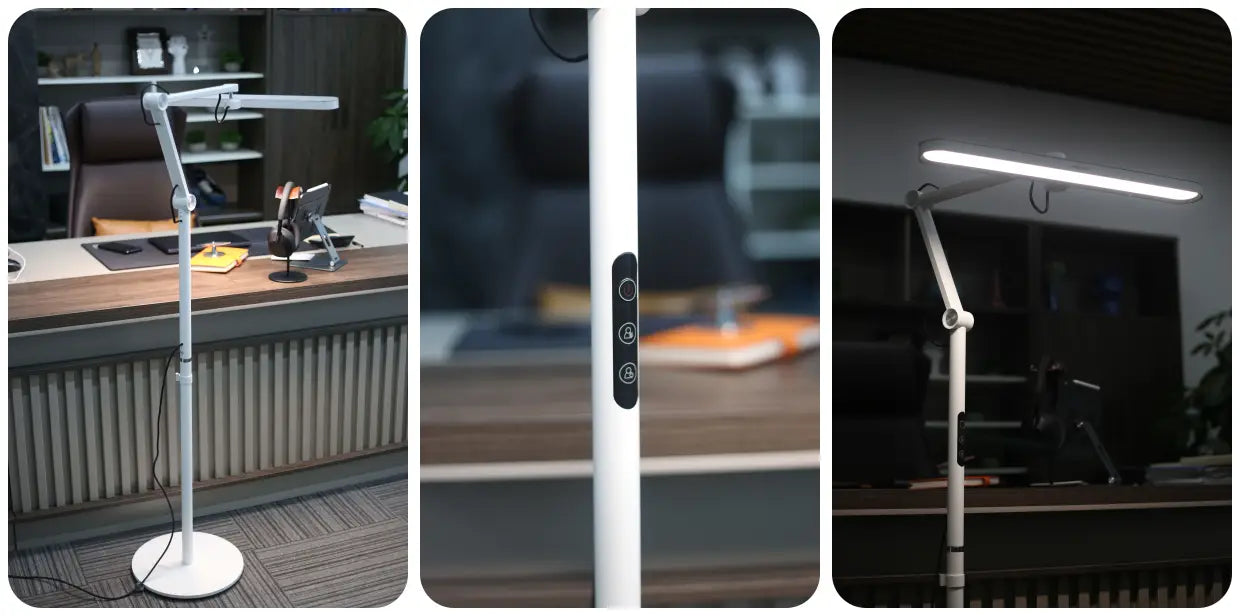 Die Lampe ist in einem sauberen matten Weiß gehalten, mit drei eleganten Touch-Bedienelementen in der Mitte des Stabs: eines für Ein/Aus und zwei zum Umschalten der Beleuchtungsmodi. Das minimalistische Design verleiht jedem Studio oder Heimarbeitsplatz eine moderne, elegante Note.